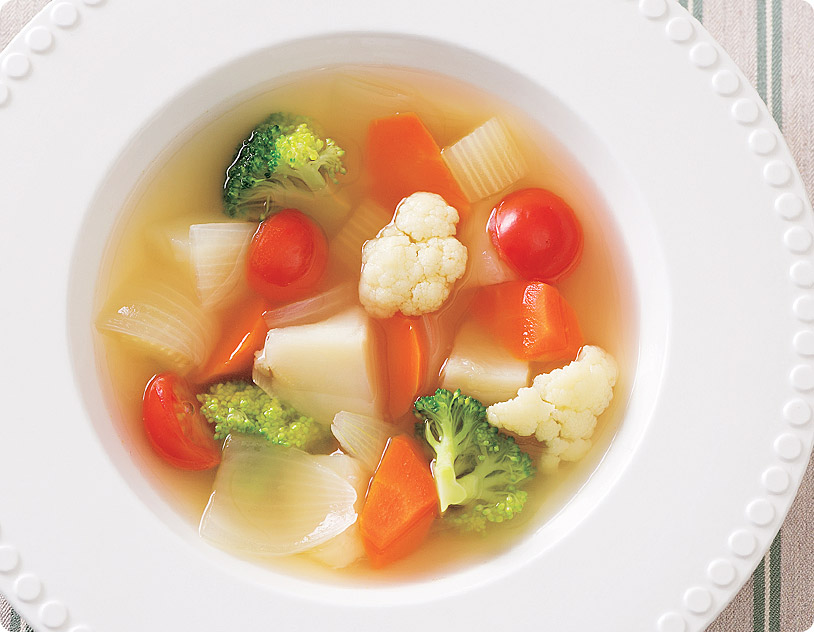 鍋に【A】とじゃがいも、にんじんを入れて煮立て、玉ねぎ、セロリ、カリフラワーを加えて15分ほど煮る。ブロッコリー、プチトマトを加えてひと煮する。